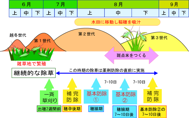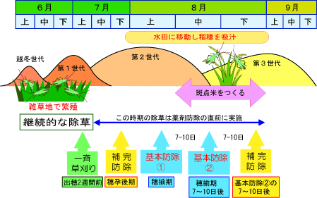 7月中の発生が多い場合は、その前の穂孕後期にも補完防除を行います。