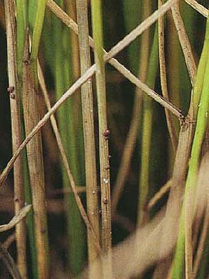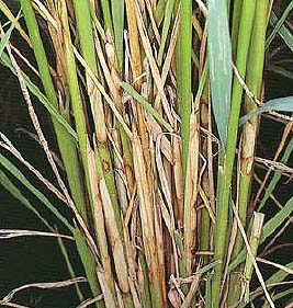 紋枯病は、高温多湿条件で発生し易く、7月初旬から葉鞘部に楕円形の斑紋(淡緑色~灰色)を形成します。