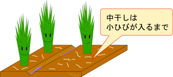 中干しは、無効分げつの抑制、根の健全化や受光体勢は良くなり、登熟向上と倒伏軽減に結びつきます。