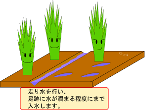 中干し終了直後は走り水を行い、足跡に水が溜まる程度にまで入水します。