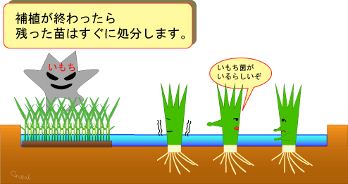 補植用苗の取り残しは、葉いもちの重大な伝染源となります。補植作業後には速やかに抜き取って処分します。