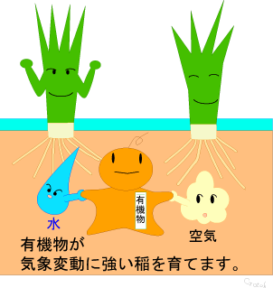 有機物の施用は土壌中の養分量を高めるとともに、水分や空気を保持する機能を増大して気象変動に対する抵抗力を高めます。