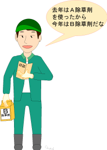除草剤には、雑草の葉齢に合わせて薬剤を使い分ける体系除草剤と、1回の処理で多年性雑草を含めて、多くの種類に効果のある一発処理除草剤があります。