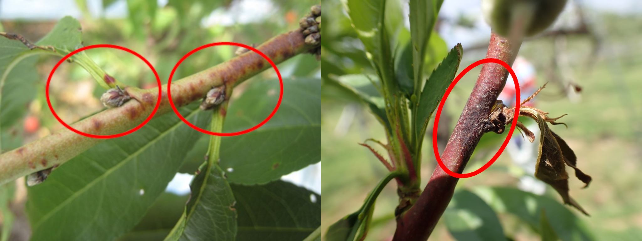 主な越冬伝染源(落葉痕、芽基部)と春季に発生する春型枝病斑