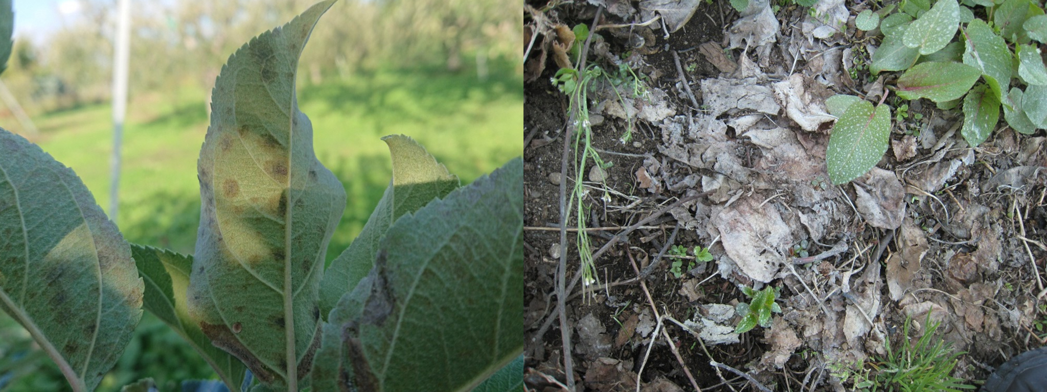 前年秋季に見られた病斑と伝染源となる前年の被害落葉